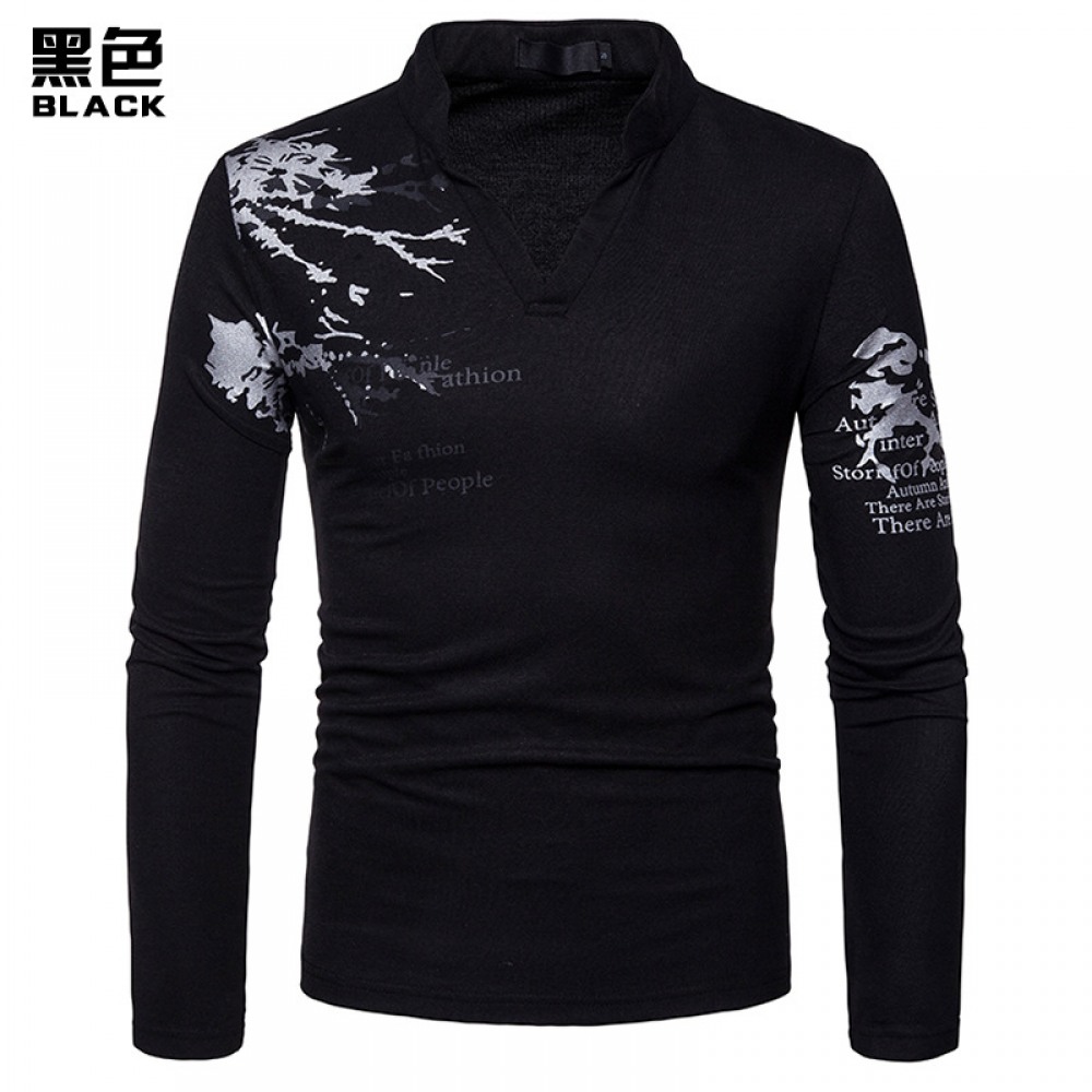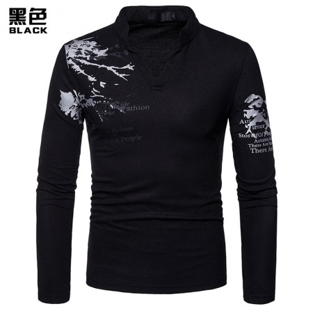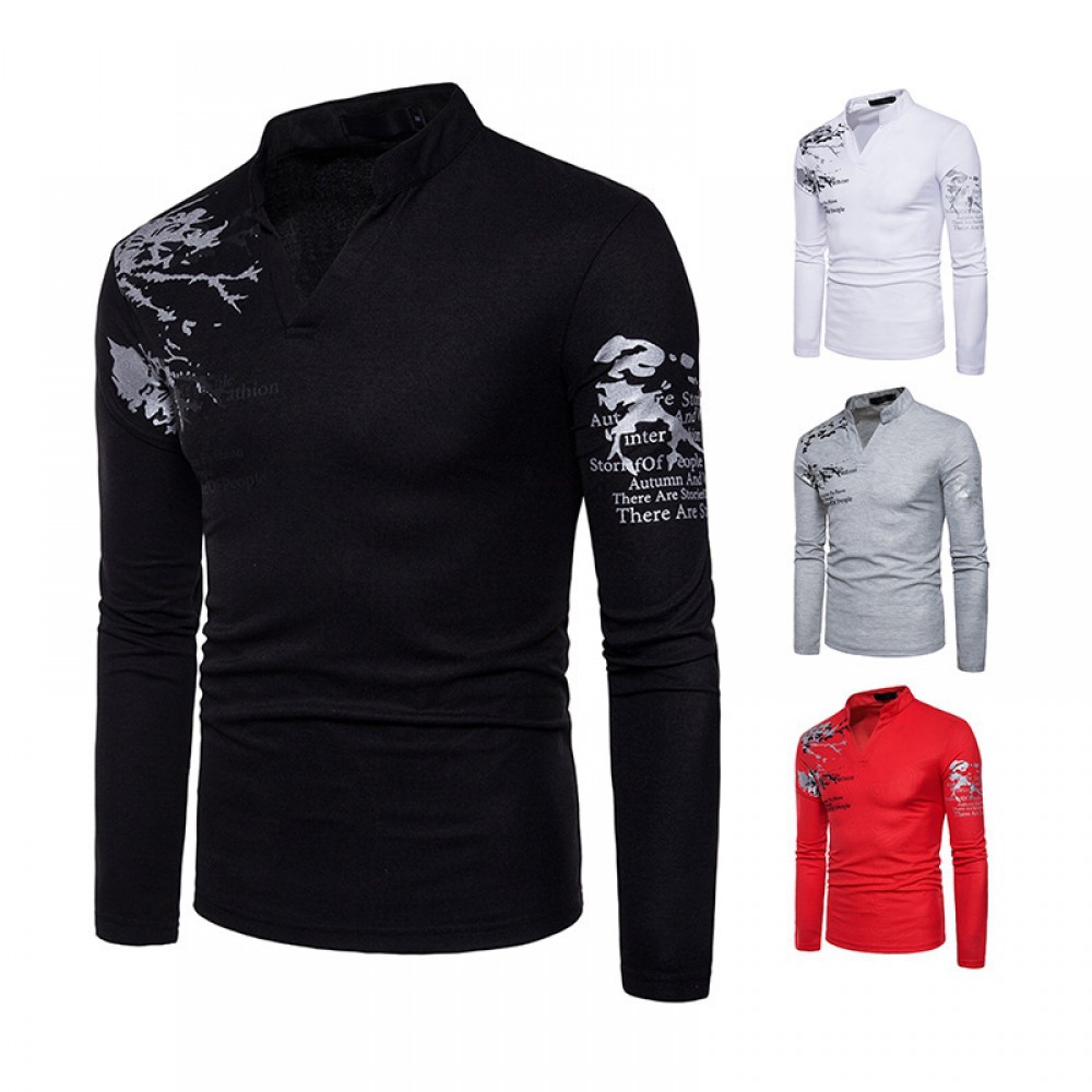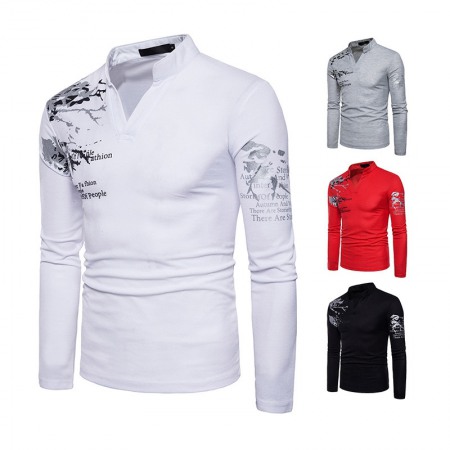 New Fashion Men's Henry Collar Long Sleeve Print T-Shirt Polo Shirt